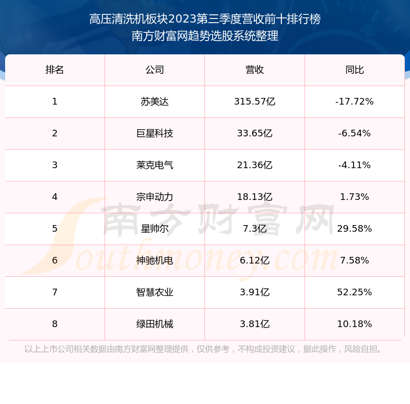 按照南方财富网趋势选股系统统计,该股所属板块为高压清洗机板块,该板块共有8只股票,绿田机械2023第三季度营收在该板块中排名为第8名,该板块2023第三季度营收排名前十的股票如下表: