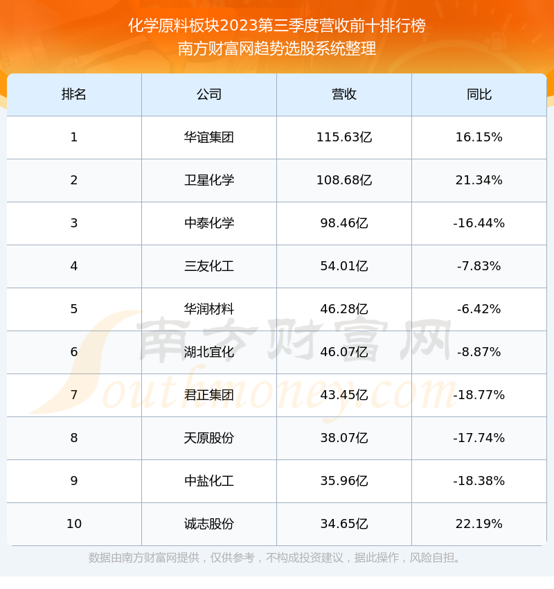 按照南方财富网趋势选股系统统计,该股所属板块为化学原料板块,该板块共有67只股票,呈和科技2023第三季度营收在该板块中排名为第67名,该板块2023第三季度营收排名前十的股票如下表: