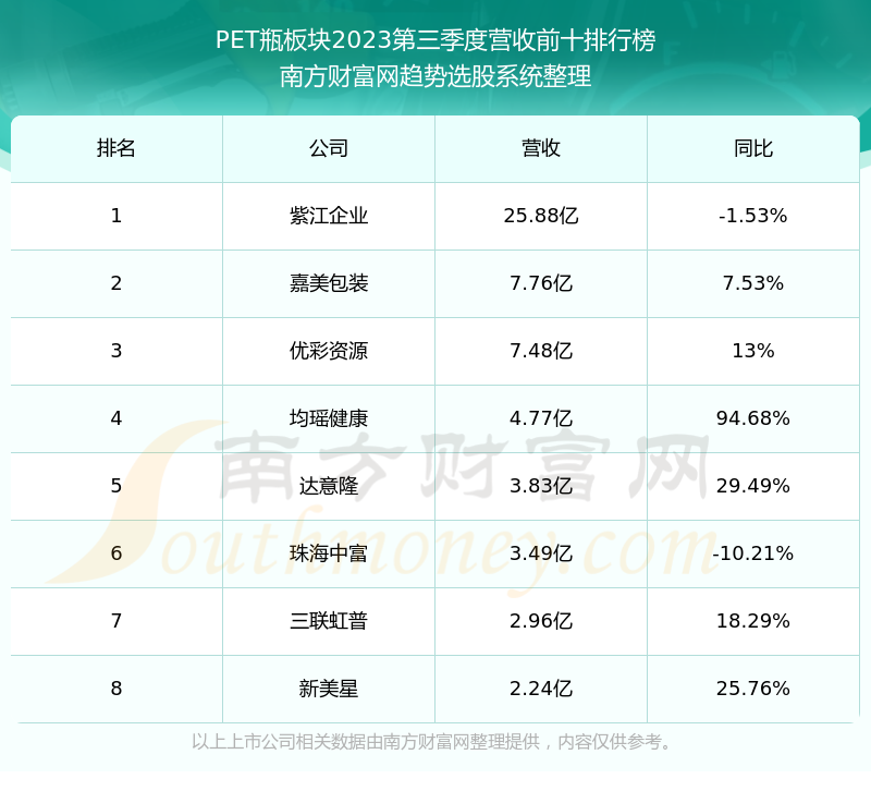 按照南方财富网趋势选股系统统计,该股所属板块为PET瓶板块,该板块共有8只股票,紫江企业2023第三季度营收在该板块中排名为第1名,该板块2023第三季度营收排名前十的股票如下表: