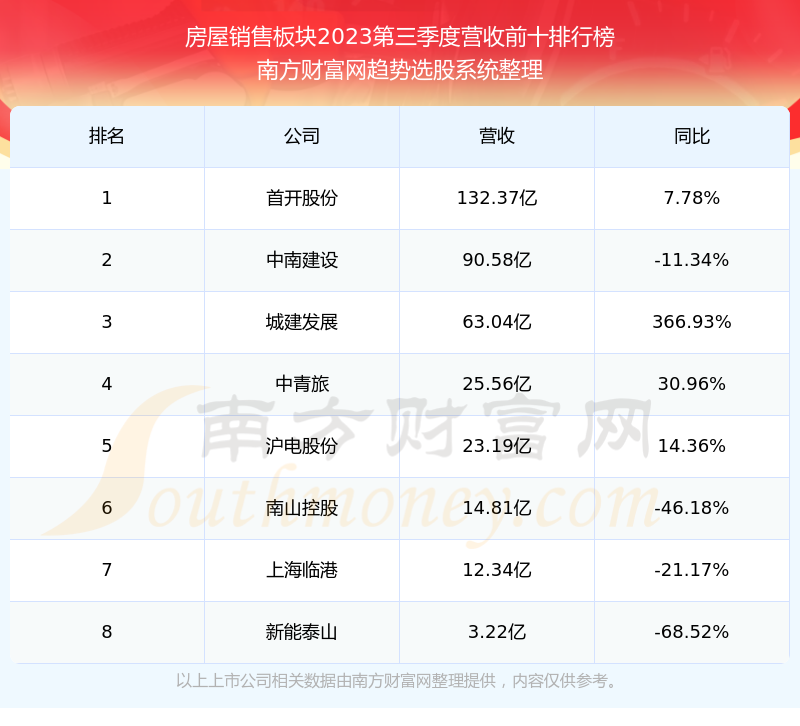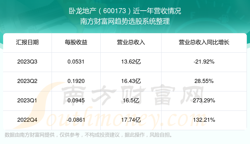 按照南方财富网趋势选股系统统计,该股所属板块为房屋销售板块,该板块共有8只股票,卧龙地产2023第三季度营收在该板块中排名为第8名,该板块2023第三季度营收排名前十的股票如下表:
