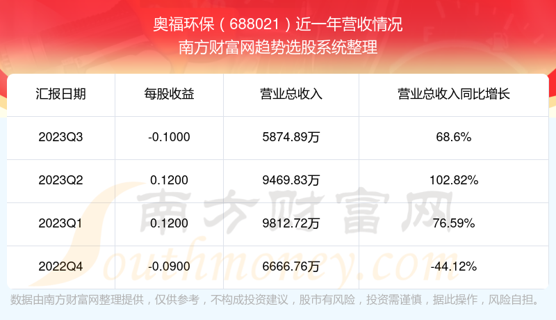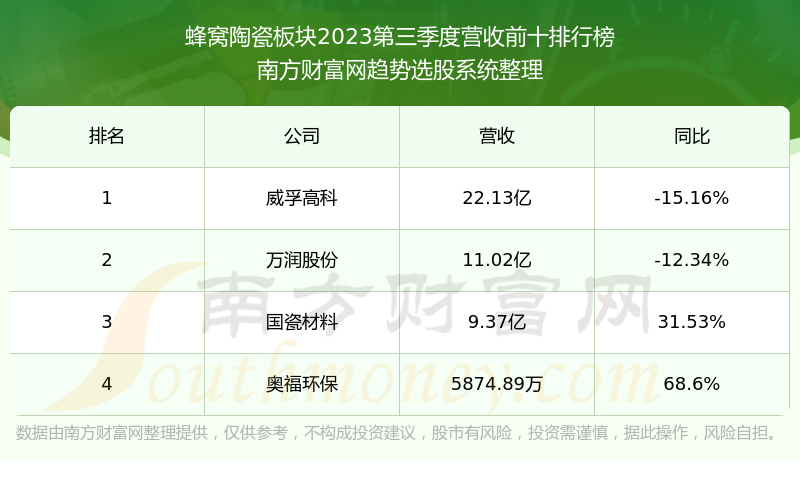 按照南方财富网趋势选股系统统计,该股所属板块为蜂窝陶瓷板块,该板块共有4只股票,奥福环保2023第三季度营收在该板块中排名为第4名,该板块2023第三季度营收排名前十的股票如下表: