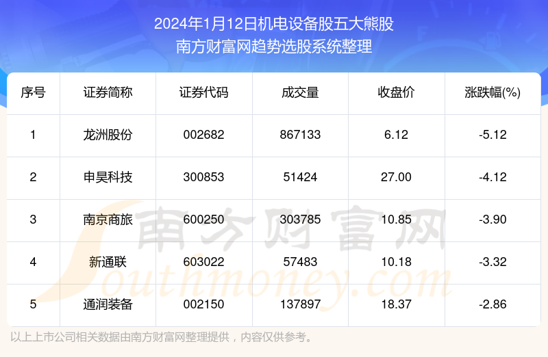 截止2024年1月12日,个股表现方面,机电设备股当日领跌股为龙洲股份(002682),该股当日报收6.12,上涨-5.12%,成交量86.71万。申昊科技(300853)以下跌-4.12%紧随其后,该股当日成交量5.14万。此外,南京商旅(600250)、新通联(603022)、通润装备(002150)均进入当日机电设备股熊股之列。