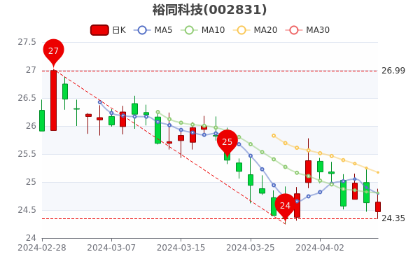 4月11日消息,今日裕同科技(002831)下午3点收盘报价24.640元,涨0.04%,盘中最高价为24.88元,7日内股价上涨0.97%,市值为229.28亿元,换手率0.4%。