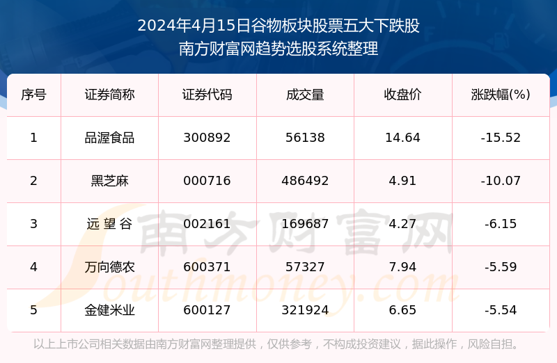 截止2024年4月15日,个股表现方面,谷物板块股票当日领跌股为品渥食品(300892),该股当日报收14.64,上涨-15.52%,成交量5.61万。黑芝麻(000716)以下跌-10.07%紧随其后,该股当日成交量48.65万。此外,远 望 谷(002161)、万向德农(600371)、金健米业(600127)均进入当日谷物板块股票下跌股之列。