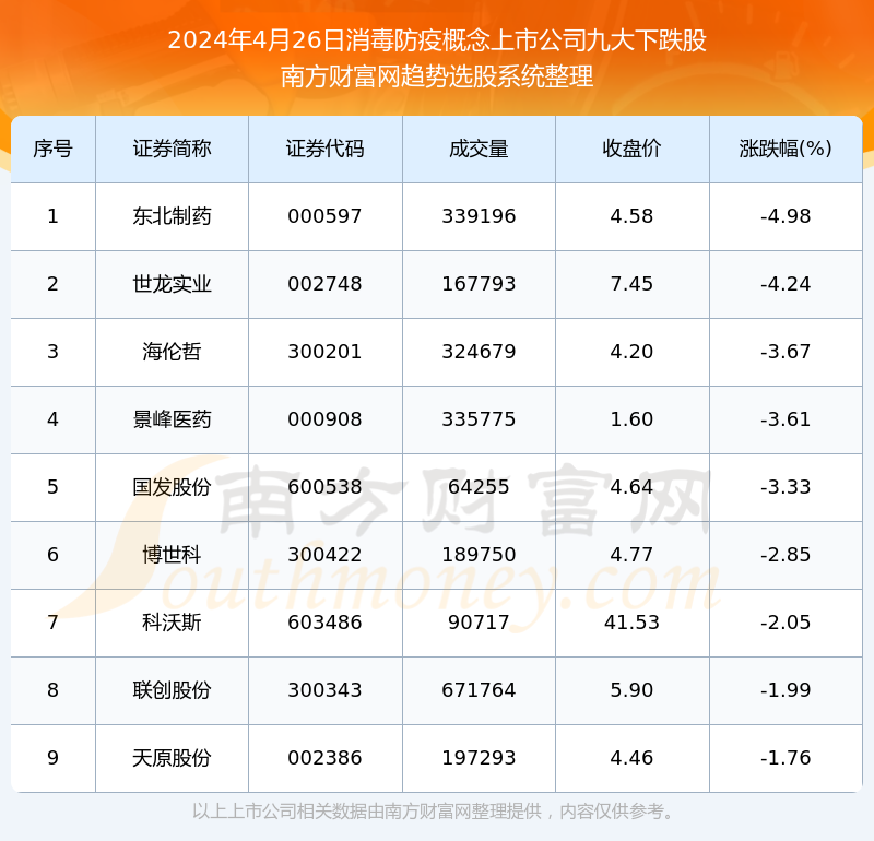 以上内容就是对【配资 数据解盘|2024年4月26日消毒防疫概念上市公司九大熊股名单】的解答,如果解决了您的问题欢迎把链接分享给朋友(https://www.anancha.cn/news-gupiaojiaoliu/54807.html)