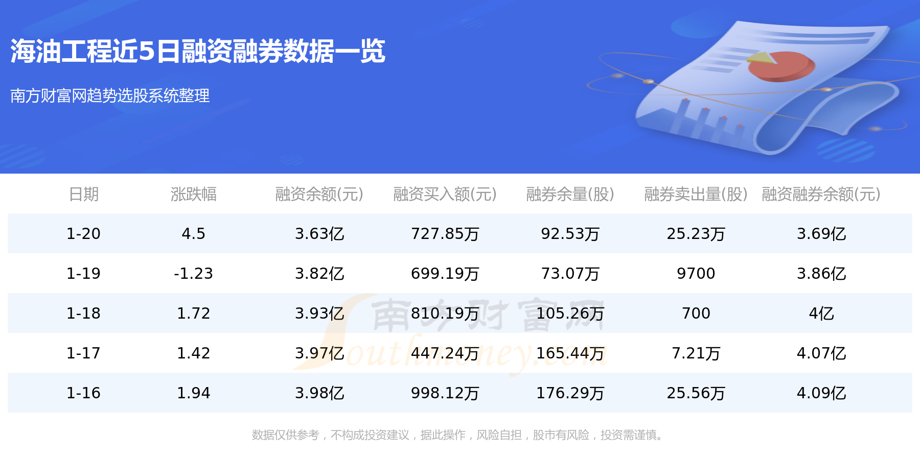 海油工程1月20日融券信息显示,融资方面,当日融资买入727.85万元,融资偿还2614.13万元,融资净买额-1886.28万元。融券方面,融券卖出25.23万股,融券偿还5.77万股,融券余量92.53万股,融券余额622.7万元。融资融券余额3.69亿元。近5日融资融券数据一览见下表: