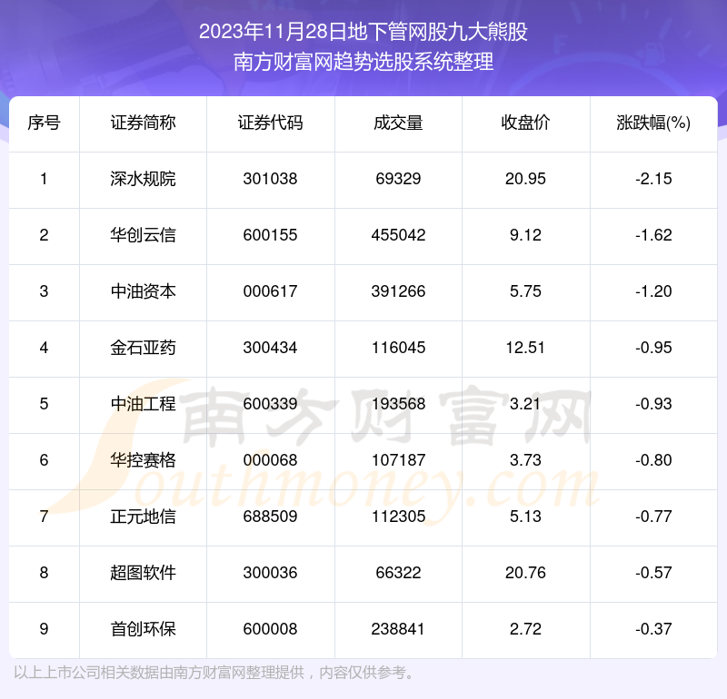 截止2023年11月28日,个股表现方面,地下管网股当日领跌股为深水规院(301038),该股当日报收20.95,上涨-2.15%,成交量6.93万。华创云信(600155)以下跌-1.62%紧随其后,该股当日成交量45.5万。此外,中油资本(000617)、金石亚药(300434)、中油工程(600339)均进入当日地下管网股熊股之列。