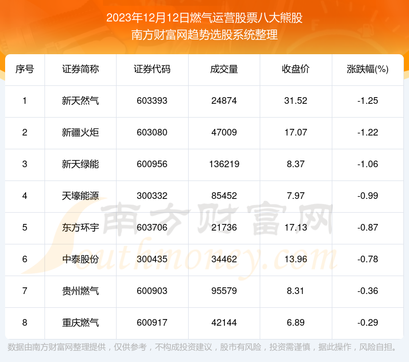 截止2023年12月12日,个股表现方面,燃气运营股票当日领跌股为新天然气(603393),该股当日报收31.52,上涨-1.25%,成交量2.49万。新疆火炬(603080)以下跌-1.22%紧随其后,该股当日成交量4.7万。此外,新天绿能(600956)、天壕能源(300332)、东方环宇(603706)均进入当日燃气运营股票熊股之列。