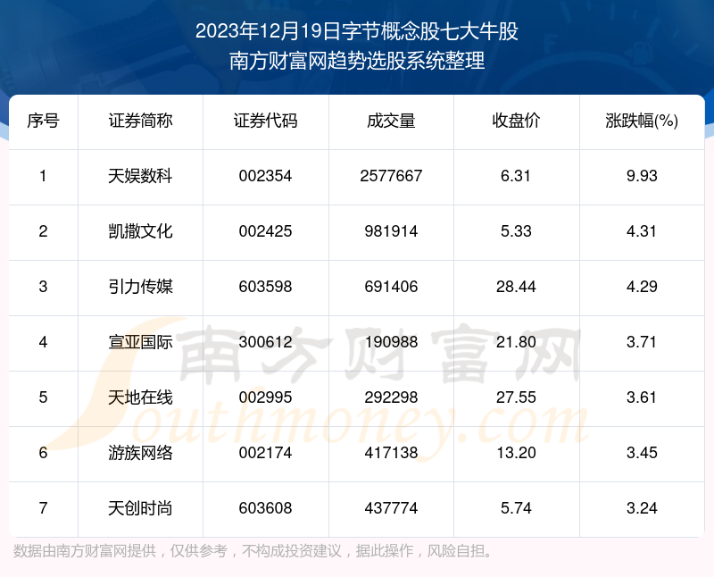 截止2023年12月19日,个股表现方面,字节概念股当日领涨股为天娱数科(002354),该股当日报收6.31,上涨9.93%,成交量257.77万。凯撒文化(002425)以上涨4.31%紧随其后,该股当日成交量98.19万。此外,引力传媒(603598)、宣亚国际(300612)、天地在线(002995)均进入当日字节概念股牛股之列。
