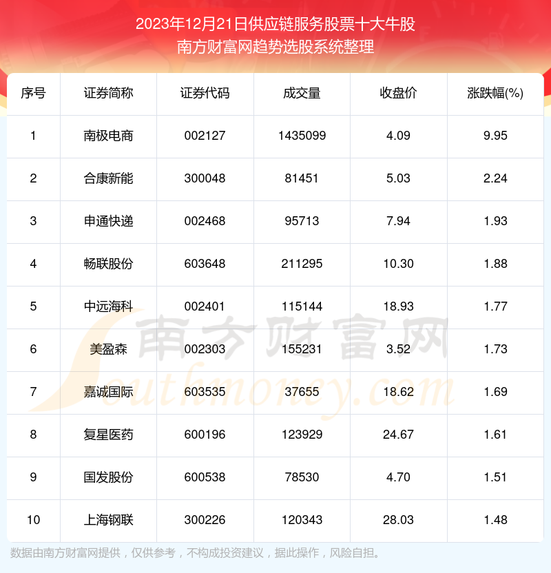 截止2023年12月21日,个股表现方面,供应链服务股票当日领涨股为南极电商(002127),该股当日报收4.09,上涨9.95%,成交量143.51万。合康新能(300048)以上涨2.24%紧随其后,该股当日成交量8.15万。此外,申通快递(002468)、畅联股份(603648)、中远海科(002401)均进入当日供应链服务股票牛股之列。