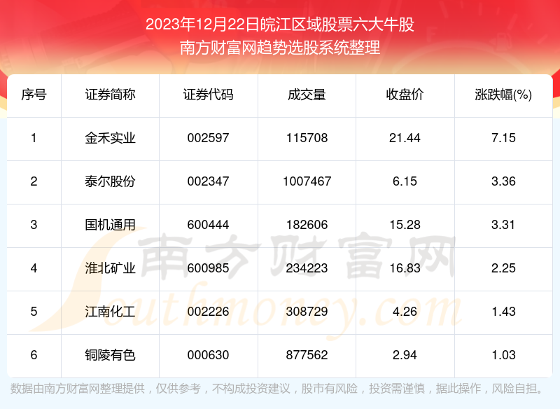 截止2023年12月22日,个股表现方面,皖江区域股票当日领涨股为金禾实业(002597),该股当日报收21.44,上涨7.15%,成交量11.57万。泰尔股份(002347)以上涨3.36%紧随其后,该股当日成交量100.75万。此外,国机通用(600444)、淮北矿业(600985)、江南化工(002226)均进入当日皖江区域股票牛股之列。